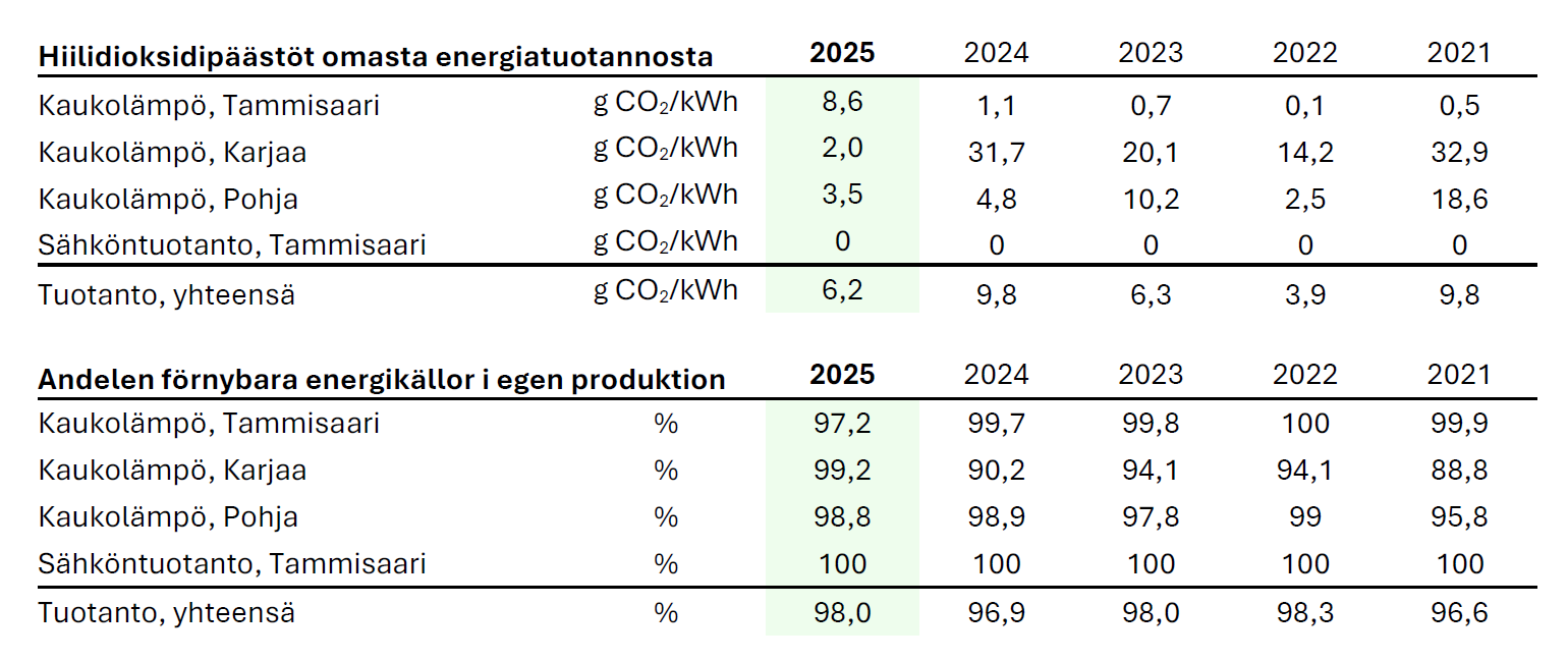 Olemme investoineet tuntuvasti ympäristöystävälliseen energiatuotantoon vuodesta 2001 lähtien ja olemme kestävän kehityksen edelläkävijöitä. Tuotamme nykyisin lähes kaiken kaukolämmön uusiutuvalla metsähakkeella. Laitoksissamme tehdyt päästömittaukset osoittavat alhaisia hiukkas-, NOx- ja SOx-päästöjä. Tammisaaren energiantuotannolle on myönnetty EKO-energiatodistus ja olemme olleet mukana energiatehokkuussopimuksessa vuodesta 2000.